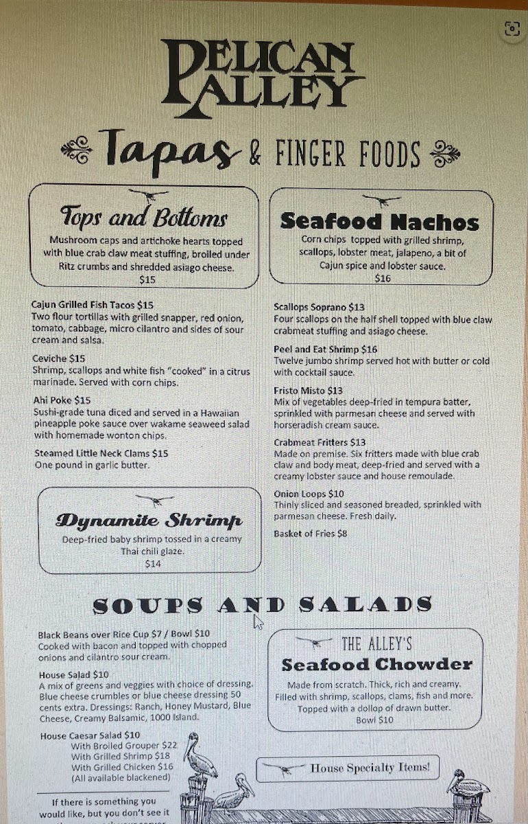 “ Fun local owned bar and restaurant on the water with the cutest decor. Better service and atmosphere than Pop's next door, they didnt even acknowledge us when we walked up so then we happily ended up at Pelicans Alley. . Lauren was super friendly and made us great cocktails. A smoked old fashioned that comes in a cute treasure box (ask about the smoke flavor options) and a tasty chocolatey espresso martini. It also has an adorable little gift shop. The dynamite shrimp is fantastic and a huge portion. ”